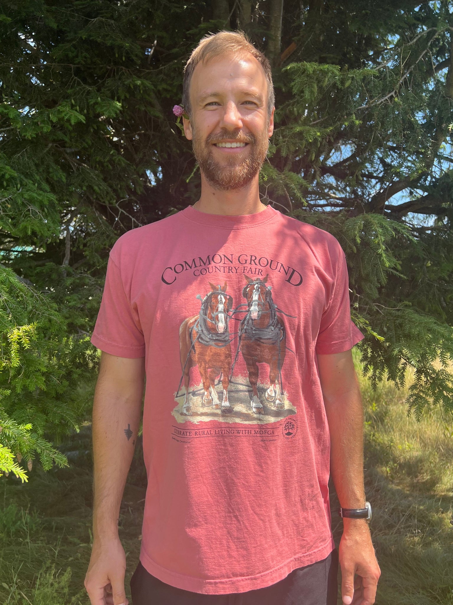 This year's artwork by Katherine Noble Churchill features two draft horses, livestock important to sustainable farming methods. From moving heavy equipment to plowing fields for planting, draft horses offer farmers an alternative to fossil fuel powered machinery.